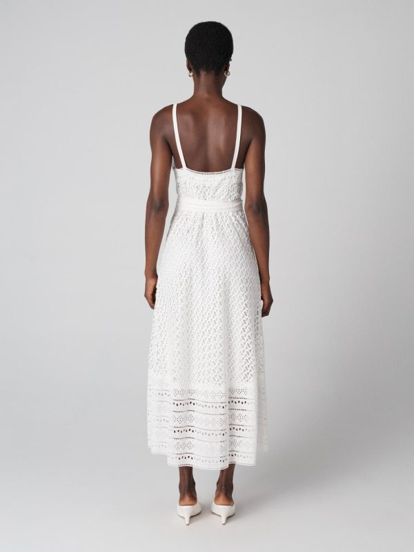 Experience timeless elegance with the Evangelia midi wrap dress, featuring exquisite Cane Link lace detailing throughout for a sophisticated look.