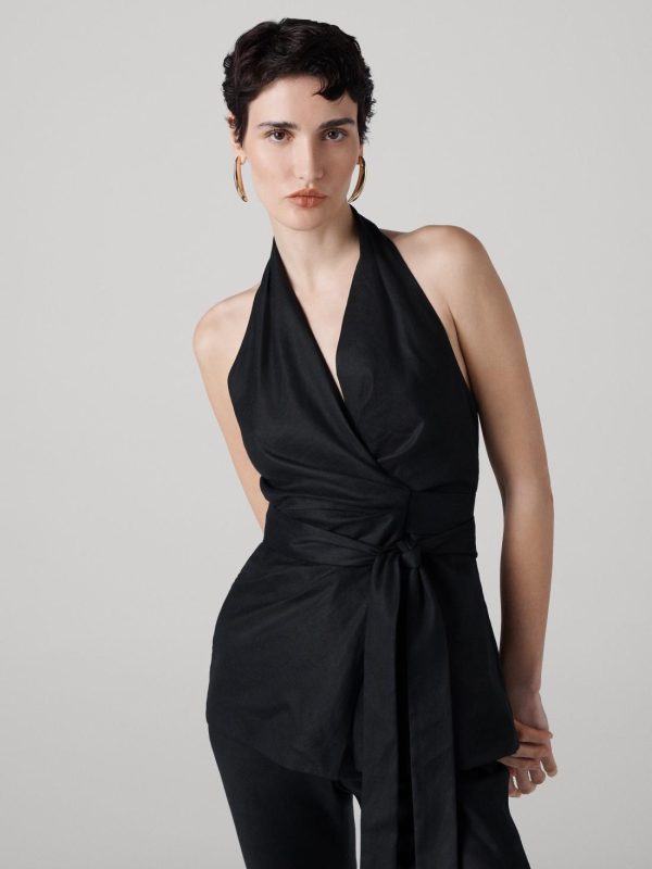 Made from a soft linen, the sleeveless Alyssa Wrap Top has a halterneck and an open back.