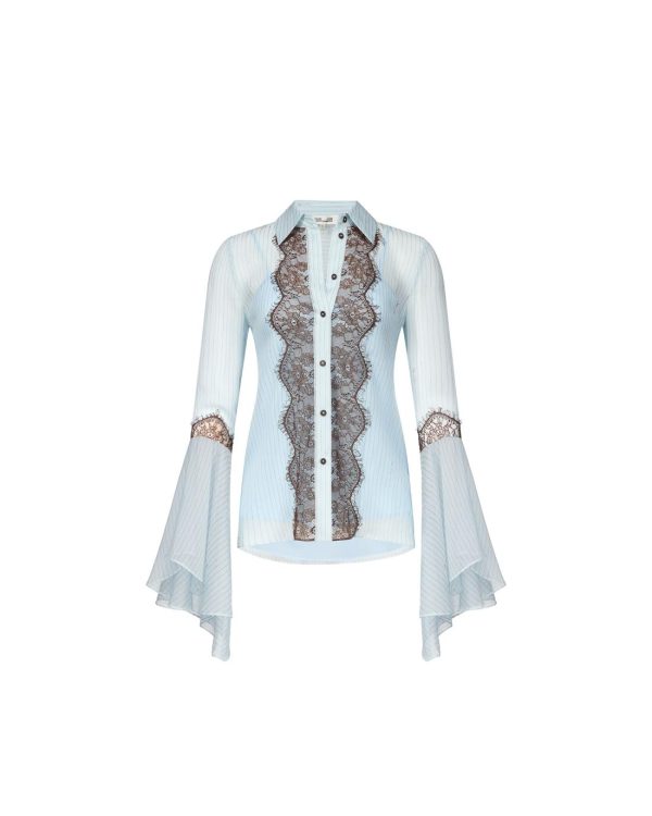 The Angela Blouse is crafted from pure silk, featuring subtle pinstripes, delicate lace accents, and a tailored silhouette inspired by classic workwear.