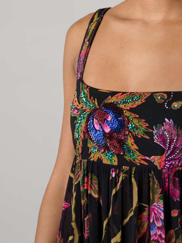 Own the night in the Blanca Gown, featuring delicate floral embellishments and a gracefully draped skirt.